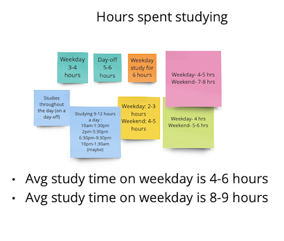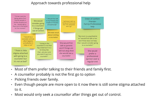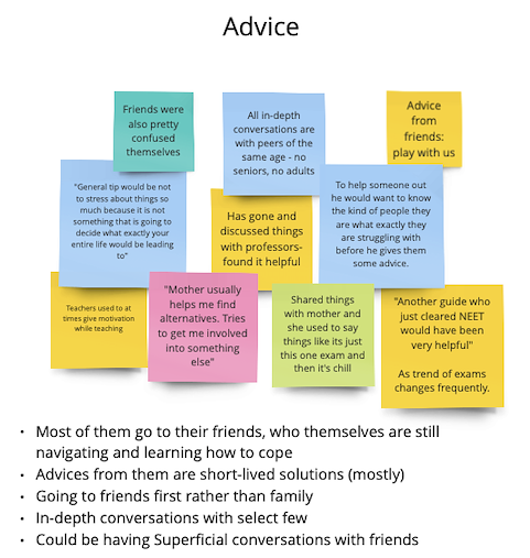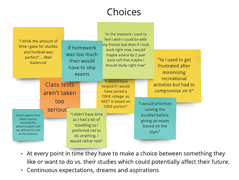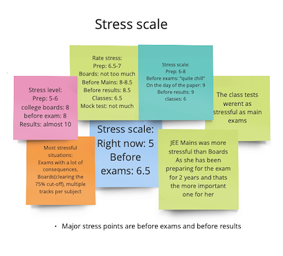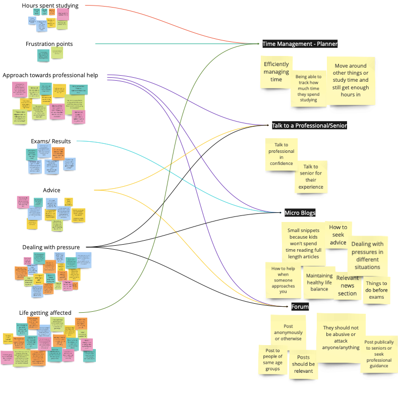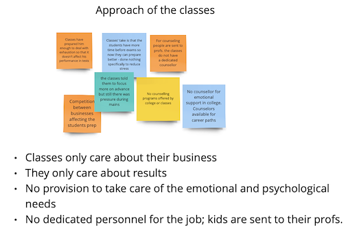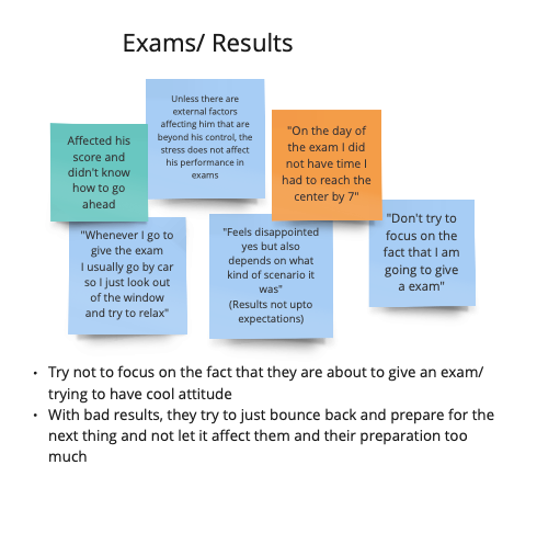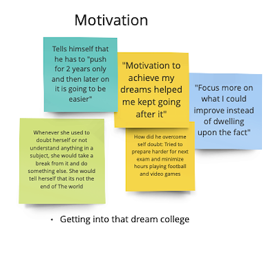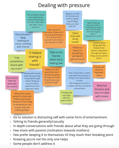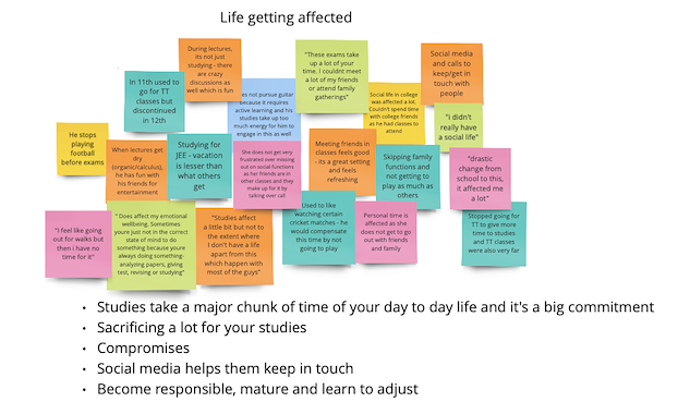 The 7 student interviews were recorded with the students' consent. After the interviews were conducted, I went back to the recordings of the interview and noted down the things that were of importance. Once these notes were made, they were organized in buckets creating an Affinity Diagram.