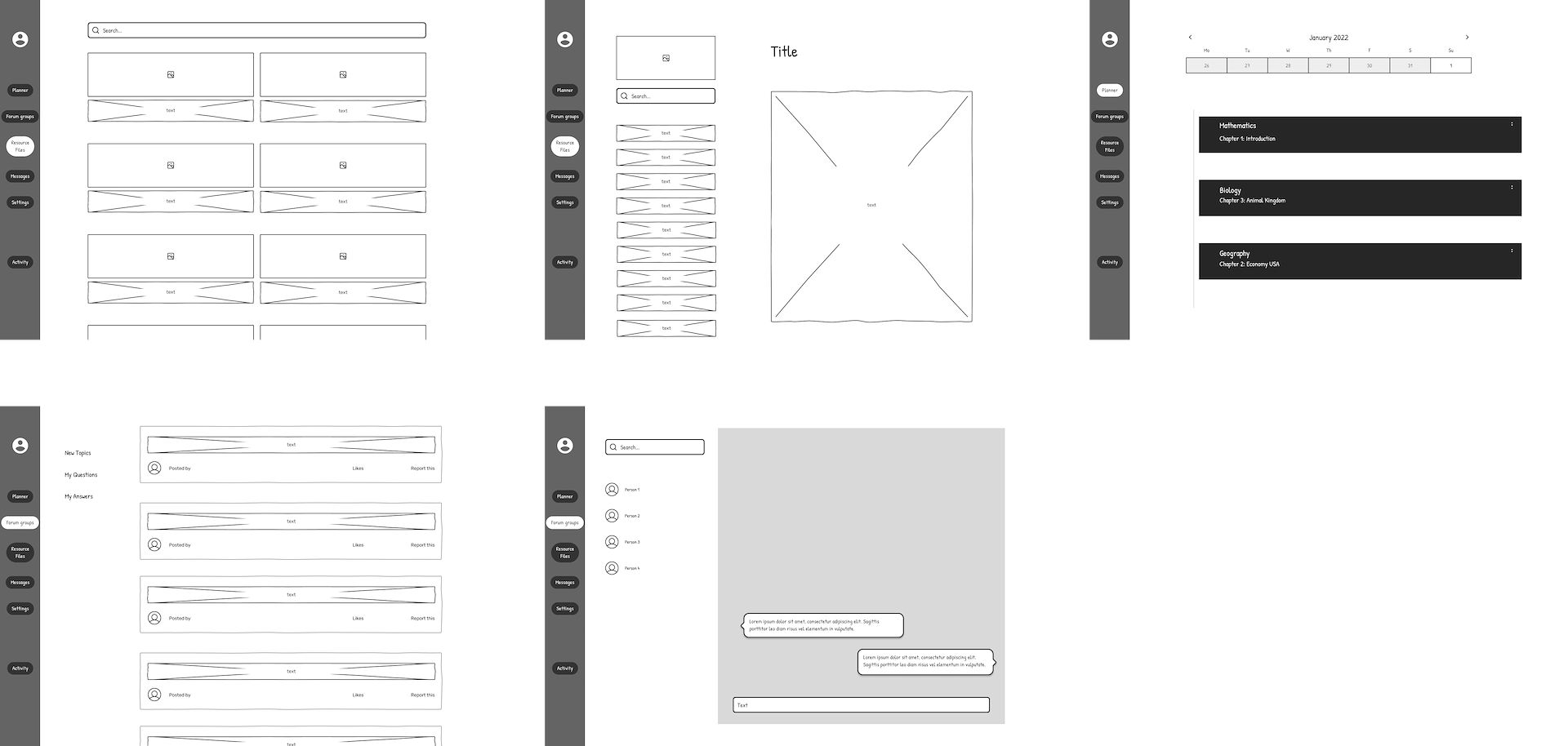 Now that I had the features listed, I started to design the solution. It began with some low-fidelity wireframes. I went back and forth a lot with respect to how I wanted the different sections arranged but finally settled on the design shown as follows. I wanted to make each of the sections equally accessible like tabs because I anticipated that students would have varying priorities as reasons to use this application.
