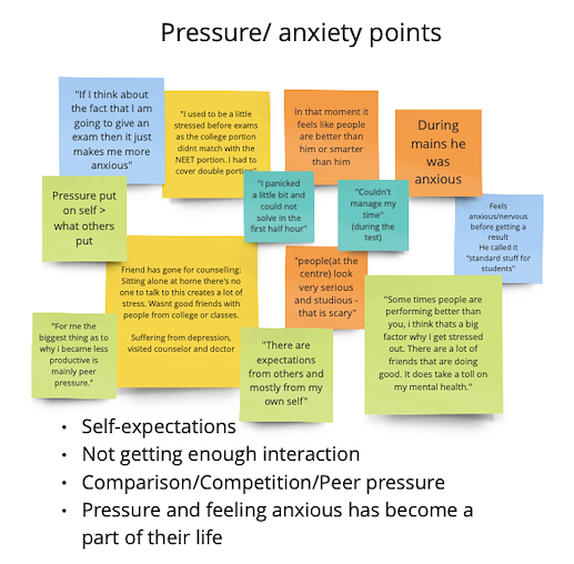 I approached students who were preparing for highly competitive exams. And spoke to them at length about their daily schedules, studies, difficulties, hobbies, etc. This gave me an insight into their day-to-day activities and it also highlighted multiple pain-points. The pain-points led to further discussions surrounding what they wish was made available to them.