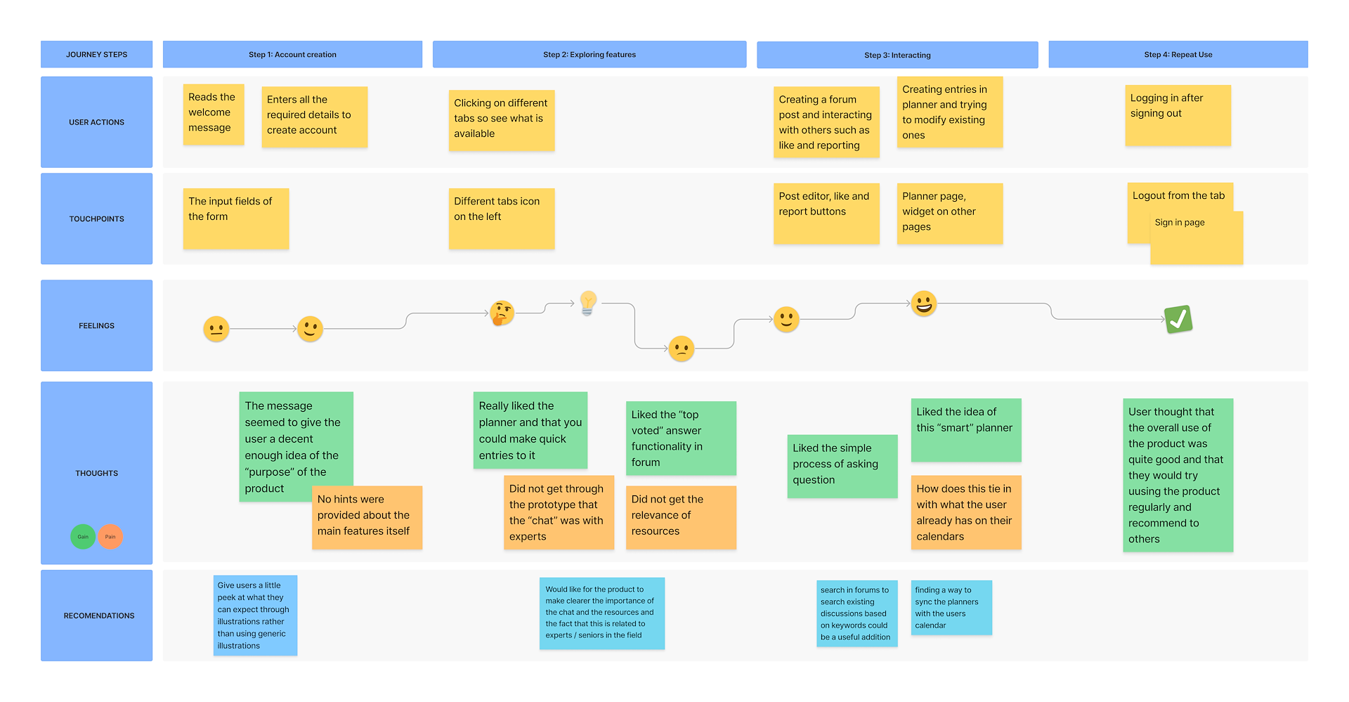 Since there were constraints on the things that I cold test and the extent of testing, I created my own version of a journey map to summarize the findings from the usability tests.