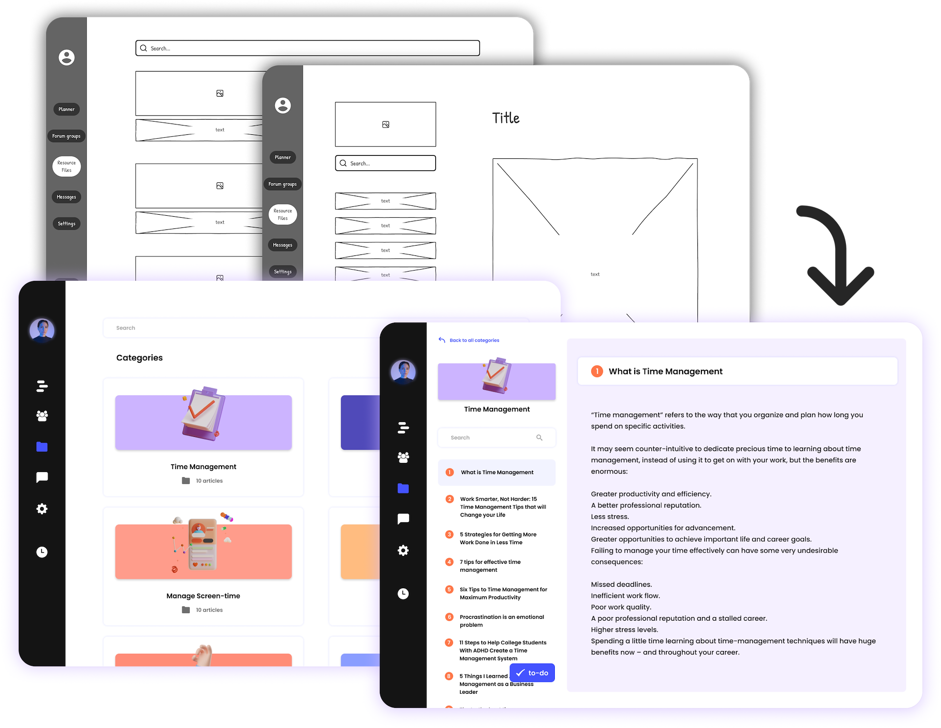 Next I created a style guide to help convert these wireframes into high-fidelity screens.